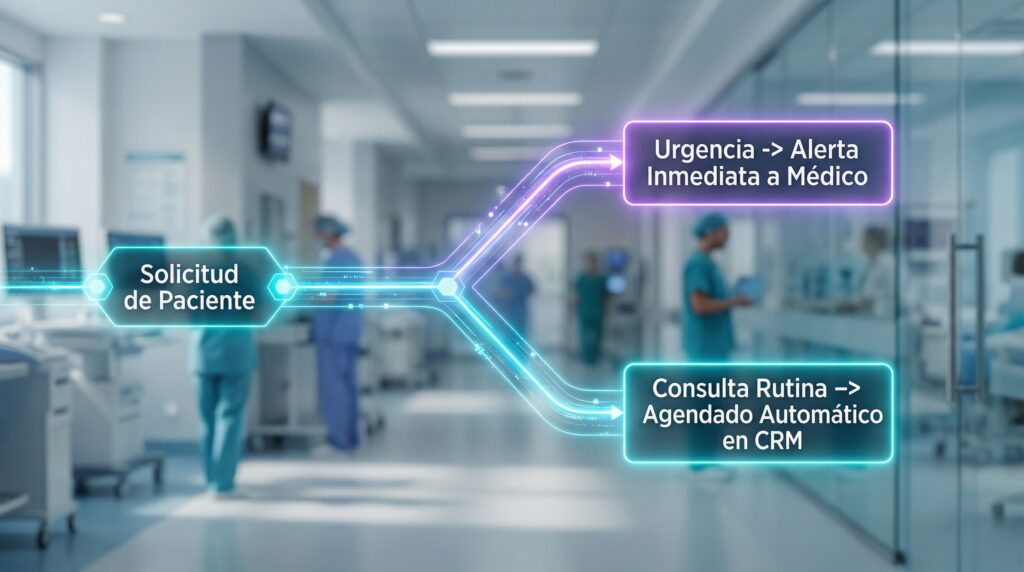 B. Triaje Digital con IA: No todas las consultas son iguales. Implementar un sistema que clasifique: ¿Es una urgencia o una cita de rutina? Un experto digital dirige al paciente al canal adecuado en segundos.